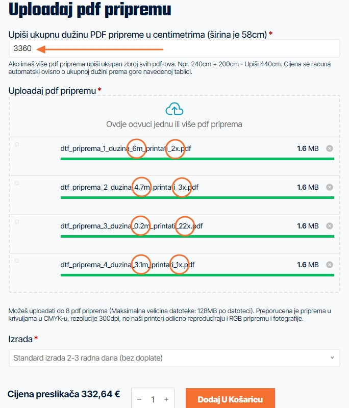 The files will be uploaded. Then in the field "Enter the total length of the PDF preparation in centimeters (width is 58 cm)" enter the sum of the length of all your preparations.
