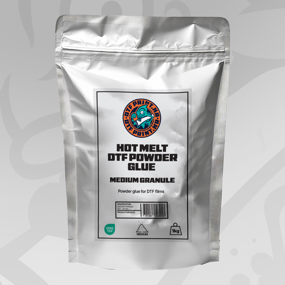 After the design is printed on the film, a heat-melting powder adhesive is applied to the still-wet ink. In smaller production processes this is usually done manually, while in industrial plants automatic solutions with vibrating machines are used. The powder must be applied as evenly as possible, and the excess is removed before the film enters the drying oven or heat press, where it is processed at around 160 degrees Celsius. In the case of using a heat press, it is recommended that the top plate does not touch the glue, but that a distance of 4 to 7 mm remains.
