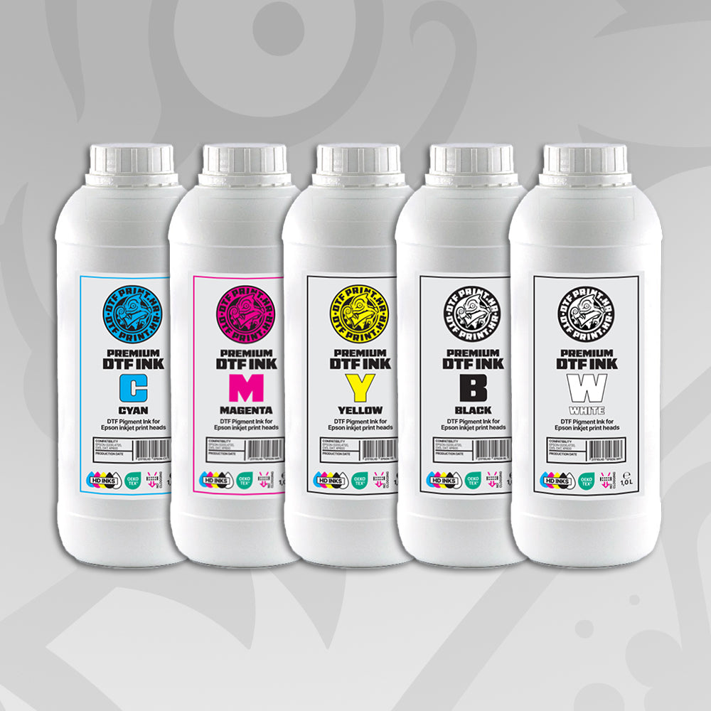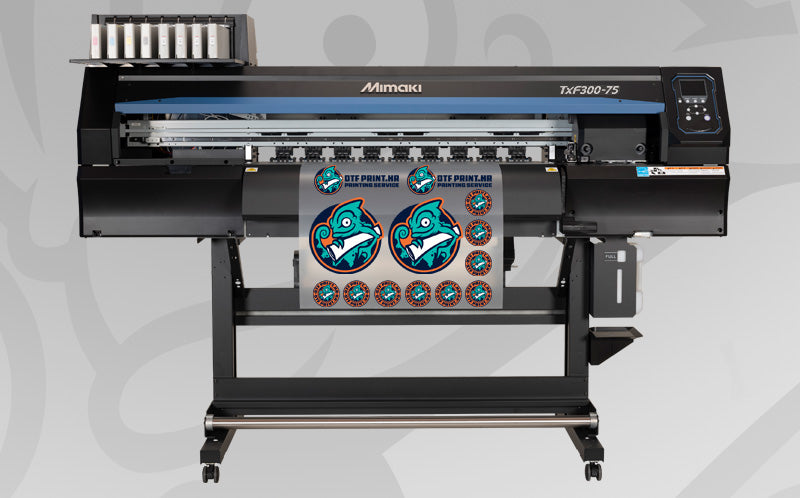 DTF or Direct-to-Film refers to a printing technique using special DTF CMYKW inks on thermal or cold release PET film, approximately 0.75 mm thick. In order for the colors to be visible on darker fabrics, white ink is needed, which serves as a base.
