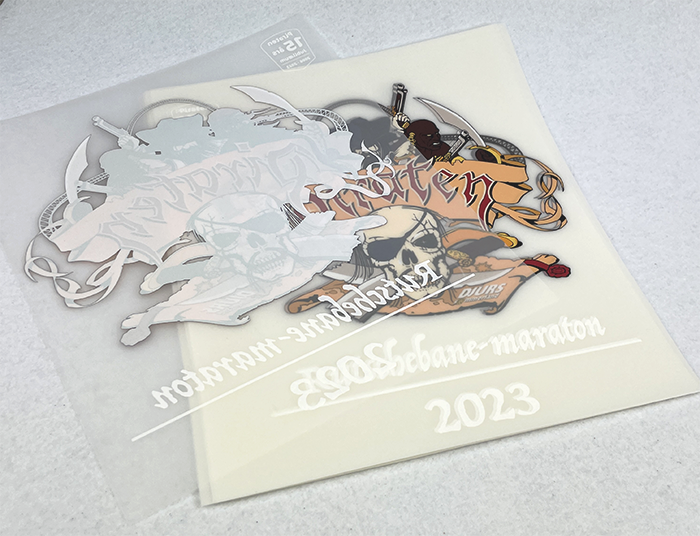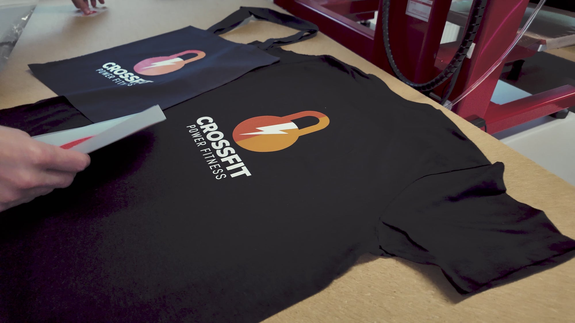 Placér dit transfer på tøjet. Pres DTF-transferet i 10 sekunder ved 150 °C, og pil derefter folien af med det samme. Spar tid i din produktion!